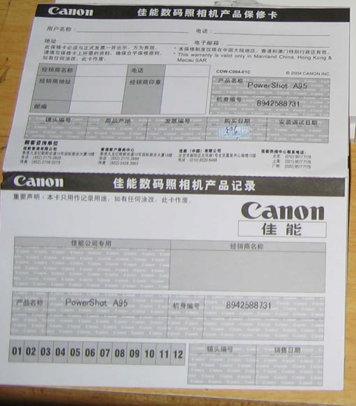 2005-9-05 周一 下午2:22 一位河南的网友在Myprice论坛发了一篇帖子:“我今天才买的A95,机身2600,没有开票。揭开了包装盒标签,下面是20位的号码啊,不是16位的,12170 XXXXX XXXXX XXXXX,可是在www.canon.com.cn上只能查16位的。怎么回事啊?还有包装盒标签上的电话是800-8577071.”