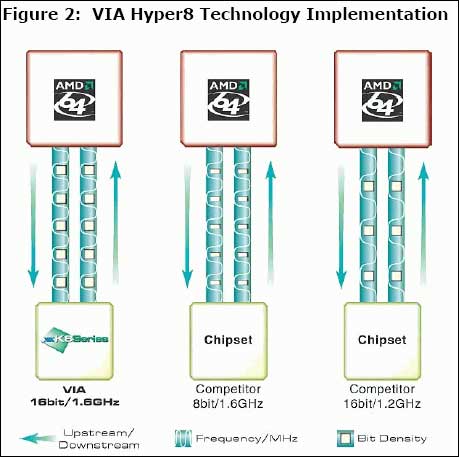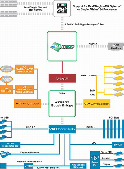 K8T800首先在AMD64(包括Opteron和Athlon 64)上实现完全16bit/1.6GHz HyperTransport技术的芯片组(800MHz的上行和下行总线),保证了CPU性能可以被充分的发挥。K8T800支持AGP 8X接口,它和南桥之间采用8X V-Link总线(533MB/s)连接,从上到下,保证了畅通的数据通道。