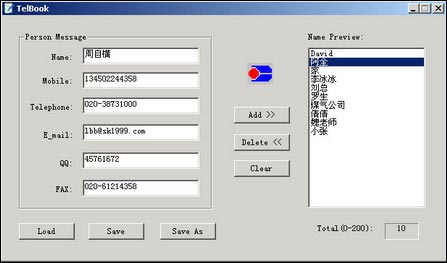 电话本功能,可存储姓名、电话号码、qq等资料