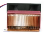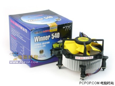 Winner540黄色的风扇显得格外醒目,它最高可以支持到Intel LGA 775 540 (3.2 GHz),以及Intel Celeron D LGA 775 340 (2.93 GHz)。Winner 540抛弃了传统风扇造型,而采用了新颖的倒挂风扇设计。风扇规格为9225,转速在2500RPM左右,最大风压55CFM,工作噪音也只有28dB(A)。这款散热片采用的是散热性能优越的铜铝结合技术,但是底部与CPU接触的表面打磨不是很光滑。
