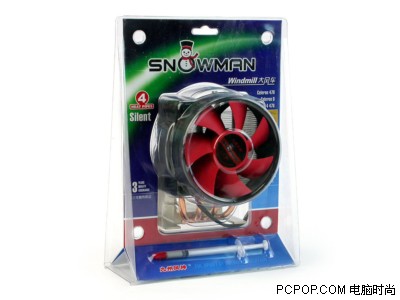 大风车散热器主要面对于那些发烧级的电脑玩家们。采用了时下比较流行的“热管+侧吹风道式”结构,“大风车”的支架部分采用了4根L型纯铜导热管,导热管的一端塞在铝合金加铜的底座中间,热量也是从这端开始流向散热鳍片的。为了有效控制散热器的重量,这款散热器在鳍片部分采用了材质重量相对较轻的纯铝制成,数量多达40片,分布均匀的贯穿在4根热管上。散热风扇部分采用一只92×92×25mm规格风扇,风扇的平均转速在2000rpm左右,最大风量为48CFM,工作噪音不会超过26dBA。 [媒体报价]:【SNOWMAN大风车】 180元