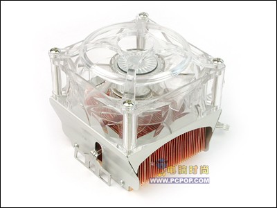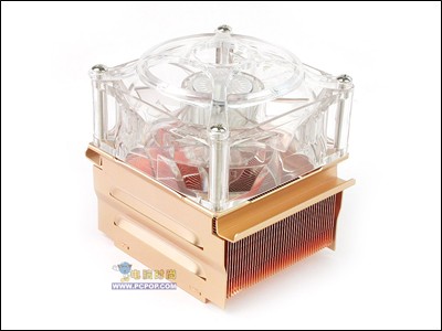“捍卫战士Ⅱ”水晶风扇外罩很独特,能防止噪音及乱流,采用80mm×80mm×32mm规格的风扇能大大提高散热能力。风扇的轴承采用CoolerMaster自己研发的来福轴承,来福轴承技术采用带有反向螺旋槽及挡油槽的轴芯,在风扇运转时含油将形成反向回游,从而避免含油流失。只有2500RPM风扇的转速,“捍卫战士Ⅱ”可以有效避免噪音的产生。 散热器的散热片采用回流焊工艺把底部的铜板和鳍片焊接起来,鳍片非常薄,也非常密,有44片之多。底部结合面采用先进地抛光工艺,使其能与CPU紧密结合。