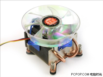 Silent 775散热器的风扇设计非常独特。从外观上来看,带有彩虹效果的风扇看上去非常的漂亮;从结构上来说,这种漏斗状的风扇可会使气流聚焦在核心,可以彻底解决了同类产品中死角问题;在风扇与散热片之间有一块蓝色铝制底盖,这种设计可以方便用户自由更换80mm或90mm的风扇。采用了90x90x25mm规格的双滚珠风扇,这种风扇最大转速仅为2500RPM!为了更好的解决LGA 775散热器的恐怖发热量,Silent 775采用了双热管+铝制鳍片。在散热片的设计上Silent 775也是下足了功夫,多达53片铝质合金鳍片,可提供高效的散热能力。