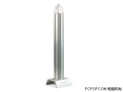 不同于大多数水冷装置所采用的散热排结构,火箭的散热水柱采用了一根高达640mm的纯铝材质圆柱体设计,并且在换热器的两端还分别加装了火箭头与火箭底座。Rocket(火箭)的头部采用了水晶状的丙烯酸(我们平时所说的压克力材质),看上去非常漂亮。由于需要被动地将CPU的热量传出来,所以散热器也就要求散热水柱与空气的接触面积能够更多,使用更多鳍片遵循的就是这个原理。散热水柱结构的结构其实并不复杂,主要由 散热水柱管、内部导管、水晶头部、水柱底部以及底座组成。
