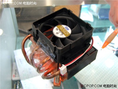 该款AVC纯铜热导管散热器,整体做工很大气,鳍片采用了纯铜材质,此款散热风扇,并不需要在主板的背面提供支架,只要散热器的四个支脚插入主板CPU周围的预留孔就可以了。四根热管经过底部后经过一个“U”型弯曲后,平行穿过上部的全铜散热片,这样就可以让冷风以最快的速度将从CPU传递来的热量带走。而底部的设计,也可以让散热器更好的与LGA775处理器接触,进一步保证了散热效果。
