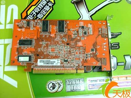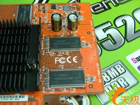 显卡采用了0.11微米的制造工艺,4条象素渲染管线和2个顶点加速引擎, 显存容量 为256M,显存带宽为128bit。这些跟其他的X550是一样的。显卡的的核心频率为400mhz,显存频率为500mhz。用的是英飞凌的4.0ns的TSOP封装DDR显存颗粒。