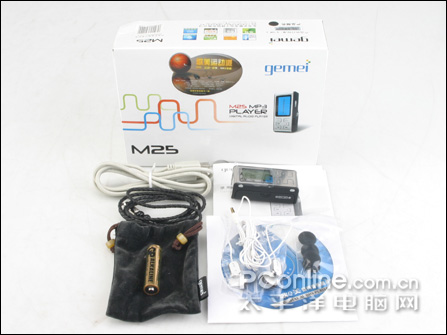 歌美M25附件共有8件,包括:驱动光盘,说明书,耳机,耳塞海绵套,5号电池,USB连接线,保护布袋,挂绳。其中耳机是歌美自主开发的,样式有特色,保护布袋和挂绳都比较精美。