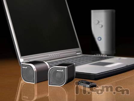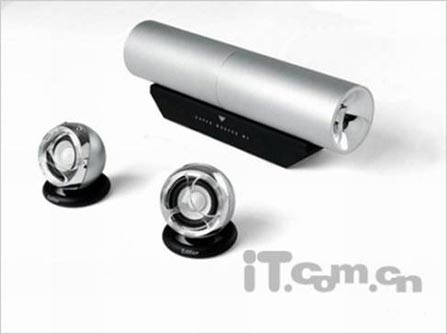 上述两款2.0笔记本音箱分别为内置USB声卡和直接接音频插孔两种类型,在造型上也分属于两极:一个是圆柱体,一个是超薄型,但总体上来说都是适配笔记本的便携性产品。在音质方面,它们使用的都宽频扬声,基本上还是能满足一般场合的应用需求。而随着多媒体应用要求的进一步提高,很多厂商也适时的推出了自己的2.1版笔记本音箱: