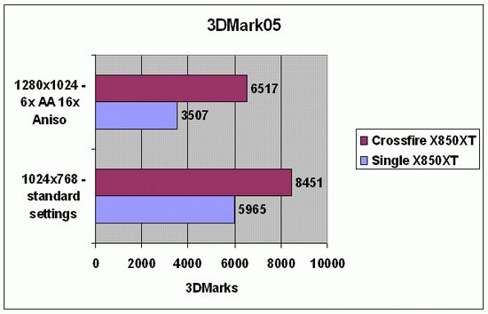 在3DMark05中,标准1024×768测试下交火配置比单卡性能提升40%,不过,当测试人员进一步加大负荷,将分辨率提高到1280×1024,抗锯齿达到6x,异性过滤达到16x,交火的优越性明显体现出来--比单卡快85%。