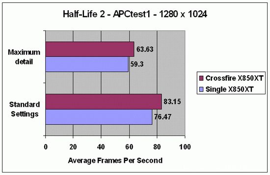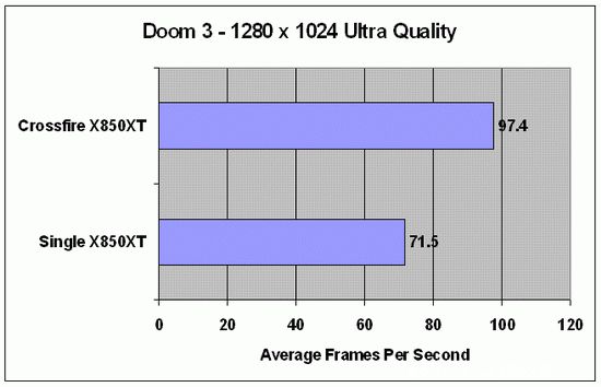 在OpenGL基础的《Doom 3》中,交火在1280×1024超高质画面下比单卡快36%,《Half-Life 2》将所有效果开到最大,1280×1024分辨率,交火比单卡快7%至10%。
