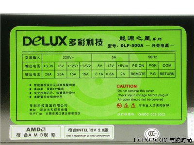 这款电源的额定功率为300W,最大功率为420W。DLP-500A电源除了得到了国内3C认证外,而且这款电源还符合INTEL 12V 2.0版规范,我们可以看到这款电源的双路+12V输出分别为15A和15A,完全可以应付目前或未来主流平台对+12V的需求。