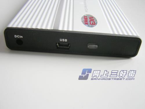 从左往右依次为电源接口,mini USB2.0接口和硬盘工作指示灯,电源采用了是 +5V 500mA, miniUSB2.0接口的传输速度为480MB/S,同时还设计了颇为人性化的“大眼睛蓝色指示灯”使用户对硬盘工作中的状态一目了然。