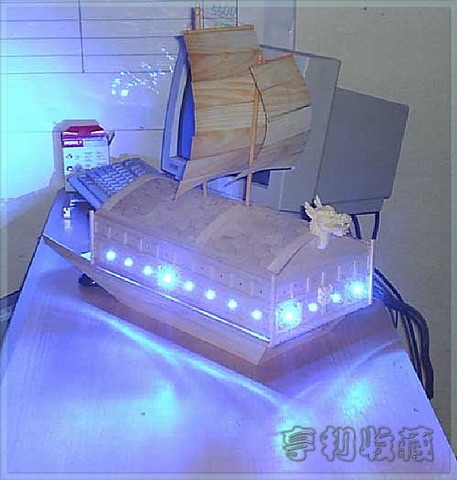 一帆风顺的木雕相信大家是看了不少了。不过一帆风顺的电脑整机应该还是非常有中国特色。这款电脑以中国古典龙形帆船为蓝本,周围加上蓝色的射灯,仿佛船上的花灯一般。