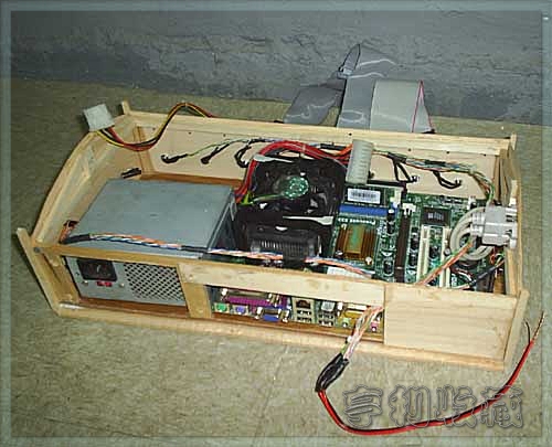 这款机器是采用木板为材料,改造者巧妙运用了船舱的空间进行安置平台。整个平台使用了478接口,也就应该是P4或者C4处理器。主板从图片上看应该是P4M266主板。MOD机器通常都会选择Mico ATX主板,一般不需要太注重性能。