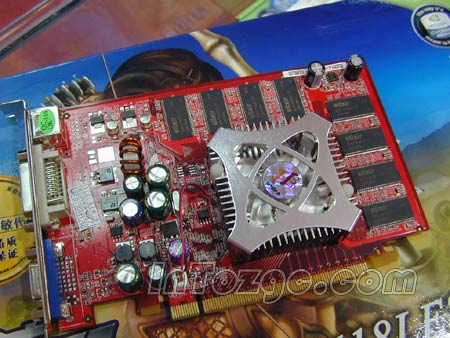 红色PCB板,主动式散热。规格方面,此款双敏速配PCX6618LES采用的是8颗TSOP封装5ns显存颗粒,组成128M/128bit的显存规格,默认核心/显存频率为300MHz/400MHz。