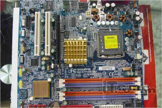 上图是技嘉的GA-8I915G-MF,和GA-8I945G-MF同样采用小板设计,但CPU供电部分为四相供电,日系高品质电容随处可见,用料相当豪华。金黄色的北桥散热片也别具特色。板载Realtek ALC880 AC97八声道声卡和Marvell 88E8001的千兆网卡。市场报价1088元。