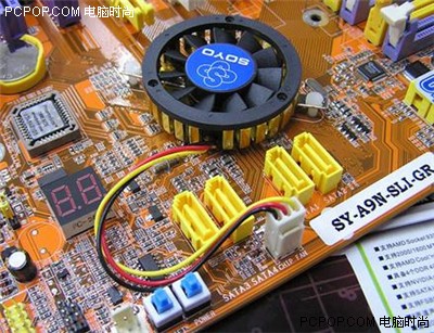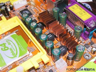 在CPU的供电上,采用三相供电,电感圈全部使用密封式的,这样能够有效地屏蔽外部的电磁干扰,而供电电容则全部使用了SANYO(三洋)和SACON两种日系高级电容。MOSFET管则使用Infineon的产品,在MOSFET上面加装了铜质散热片。