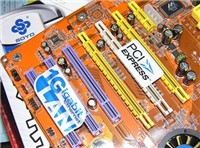 在其他一些NF4 SLI主板上,设计在两条PCI Express x16插槽之间的是SLI/Normal跳线,而在此块主板上则被替换成了一条白色的PCI Express x16插槽,不过它的工作原理与传统的SLI主板还是基本一致的,其中2根黄色插槽是用于组建SLi功能的PCI Express x8插槽,白色的插槽则是真正的PCI Express x16插槽,能够提供单卡的高速运行需求。