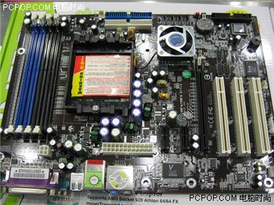 承启VNF4主板采用宽敞的黑色PCB,基于nForce4 ultra标准版设计的芯片组,能够支持Socket 939接口的Athlon 64处理器,HT总线频率支持到1GHz。处理器供电部分采用三相回路设计,主供电接口为24pin插槽,因此在电力供应方面该主板不存在后顾之忧。