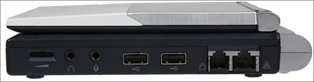 右侧接口布局十分工整,含有两个USB接口,RJ11和RJ45接口,另外还有MODEM接口。