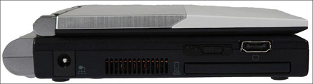 左侧含有一个PCMCIA接口,一个无线网卡控制开关,在许多笔记本中,无线网卡只能通过软件来关闭。还有通风口,电源接口,读卡器。