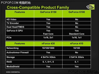 Geforce 6100及Geforce 6150同样基于NV44的绘图核心的Geforce 6绘图核心,支持Direct X 9.0、Shader Model 3.0等,并拥有2个Pixel Shader流水线及1个Vertex Shader流水线,而Geforce 6100和Geforce 6150的分别在于时脉上和Pure Video的支持上,Geforce 6100时脉为425MHz并不支持PureVideo的功能,包括HD Video、TV Encoder、Dual Head/TMDS等等,而Geforce 6150时脉则为475MHz,并完全支持PureVideo功能,成为两者最大分别。虽然是内建显示核心,但Geforce 6100及Geforce 6150也内建了PCI-E Lanes,能提供一组PCI-E x16绘图接口,但Geforce 6150却可多支持2个PCI-E x1扩充槽,而Geforce 6100却只有一个PCI-E x1。