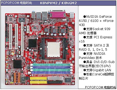 在NVIDIA发布C51芯片组之后,微星科技也紧接着发布了其三款基于C51芯片组的主板。这三款主板的型号分别为K8NPVM2、K8NGM2和K8NGM-V。其中K8NPVM2和K8NGM2主板在用料和布局上完全相同,唯一的区别就是K8NNPVM2采用的是GeForce 6150芯片而K8NGM2采用的则是GeForce 6100芯片。这两款主板的详细规格请看下表。