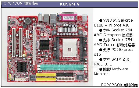 K8NGM-V主板与前面两款主把相比,它定位在低端。采用的是GeForce 6100+nForce410芯片组,支持的是AMD Socket 754处理器,并且只提供2个S-ATA2接口、2个内存插槽及两相CPU供电回路。