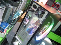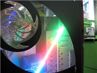 不过当笔者看到了它侧面的设计后,笔者更觉得它像个“大风车”或着“风火轮”什么的。因为在机箱侧面,多彩采用了了镂空设计。并在正对着CPU的位置,安装了一个12CM的带炫彩灯风扇,搭配着好像风车一样的风扇罩,在灯光的映衬下,还真像哪咤脚下的风火轮呢。