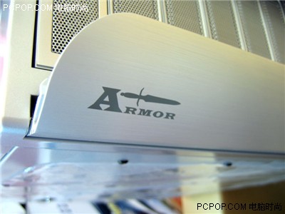 Armor直译为盔甲。Armor机箱是一款全铝全尺寸塔式机箱。其尺寸为533.4mm(H) × 222.25mm(W) × 571.5mm(L),全铝材质重量仍高达7.5Kg。 正面可以看到10个五寸位,电源按钮和指示灯设计在第1个五寸位上。对于散热也做了独特设计,前置五寸位面板上都安装了散热孔。为了防止灰尘的侵入,设计者在面板背面安装了透气的防尘网。