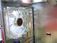 机箱的电源位是“立”着的,旁边的空间加载了1只90mm的风扇,下面也有1只120mm的风扇,Armor的散热系统可谓是做到家了。风扇的蓝色LED也为运行时的机箱增添一抹亮色。风扇蓝色光能从前面板透出来。特别漂亮。还有,当使用水冷时,可以将散热排安装在那只120mm风扇位上。