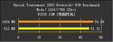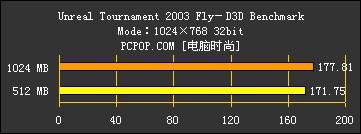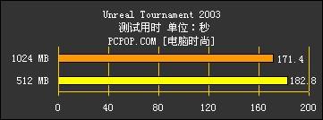 UT2003我们采用了记时+得分的方法,这样不仅能够看出不同容量之间的性能差异,还能看到时间上的变化。经过测试,1G内存不论在得分上还是时间上都取得了一些优势,但优势并不那么明显。