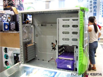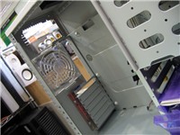 拆开永阳战神5603机箱的侧板我们可以看到其内部具有5个3.5英寸硬盘架,4个5.25英寸光驱架。其中一个3.5英寸架被放在机箱架的最上面,用来当成软驱架,如果不需要软驱就可以当成硬盘架用了。