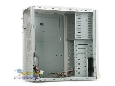 这是机箱的内部情况,可以看到其内部拥有超大空间设计,可适合安装各种不同规格的主板,各个边角都是全折边不伤手设计,并且有EMI防磁设计,箱体材料则使用了优质镀锌板,坚固耐用。驱动器扩展方面则提供了三个光驱位,一个软驱位以及六个硬盘位。