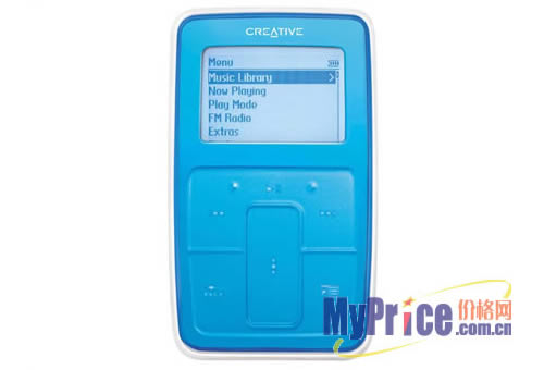 Zen Micro外形尺寸约51×19×84mm,重量108g左右(含电池)。机身圆滑可爱,如果说iPod mini是个高贵大家闺秀,那Zen Micro就是一个调皮的小家碧玉了。这次创新公司在Zen Micro的色彩上下足了功夫,一共有紫、深蓝色、银、淡蓝色、绿色、海棠、红色、桃红色、白色、黑十种颜色可以选择。现在拿在我手上的是一款淡蓝色的Zen Micro,颜色很正,靓丽大方。