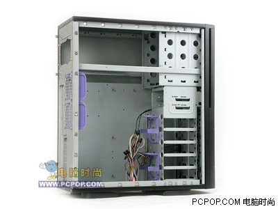 机箱的内部情况,作为对8K的的一点改进,硬盘支架部分作了90度旋转,这样更加方便我们安装或者拆卸硬盘,不过使用SATA硬盘的玩家需要注意,这可能会让你的SATA线与机箱侧板发生“零距离接触”。