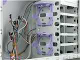 同时硬盘支架上还有两个风扇位,在兼顾了硬盘散热的同时,更可以与机箱后部的两个8cm风扇位共同组建一条机箱内部风道,从而弥补了没有AGP槽散热孔的缺陷,而且散热效果会更加优秀。