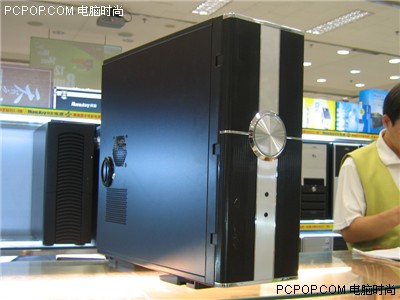 由于该款机箱的前面板设计非常醒目,因此笔者一眼在机箱丛中发现了它。在前面板上,该款机箱设计了一个类似家电调谐旋钮的装饰,并且表面经过拉丝处理,配以金属光泽,时尚气息相当浓郁。