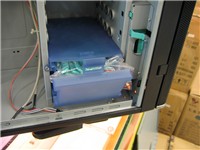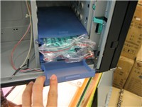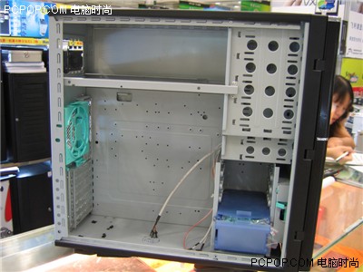 内部环境,如我们想象的那样,宽敞、大气。可能是考虑到箱体结构比较大,因此在机箱内部还特别加装了固定支架,以加固机箱。机箱外部采用1.2MM镀锌钢板,内钢板1.0MM,5寸托架5个,3.5寸9个,全免工具安装,前后各一12×12CM风扇位,侧面板一个8×8CM风扇位,下面一排散热孔,机箱很高很长。机箱的EMI防辐射也做的很到位。
