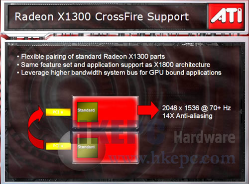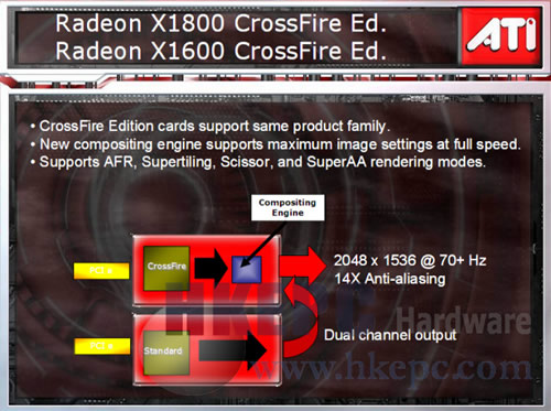本来说不支援CrossFire的RV515 Radeon X1300,现在又变成支援CrossFire了,不过ATi并没有打算为其推出CrossFire Edition,因为ATi将会开放不用Composition Engine的CrossFire模式给Radeon X1300,两者的资料会则过PCI-E的频宽达成,同样会支援AFR、SuperTiting、Scissor及提高画质的SuperAA Reeading Mode。据编辑部和ATi的电话会议中表示,现时并未知会否开放不用Composition Engine的CrossFire模式给Radeon X1600及Radeon X1800,因为Radeon X1300属于低阶,其速度及解像度将不会被用家开于得太高,因此透过PCI-E频宽成沟通影响不大,但在高阶使用没有Compositing Engine,则会出现大幅的效能差异,据ATi透露大约于高层使用非Compositing Engine,只比使用Compositing Engine下降60%效能。