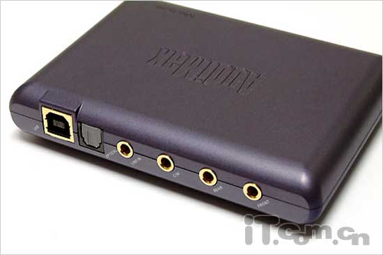 同样由于身形小巧,所以该声卡的定位也非常的明确,主要以笔记本、准系统用户为主。深紫色的外调成熟而稳重,把德国人那种严谨认真的风格表现得相当的突出,亚光磨砂材质的塑料外壳在顶部还有凹刻的“AudiMax”字样。大小如同一个普通的工具盒,体现了USB声卡携带方便的特点。