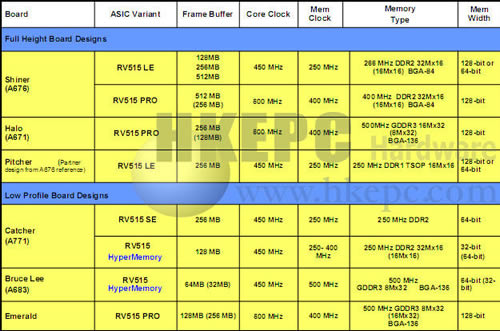 RV515核心保留支援HyperMemory的能力,现时已知道会推出32MB 32Bit及64MB 64Bit版本的ATi Radeon X1300HM,核心时脉为450MHz和X1300看齐,记忆体方面会用上-2.0ns GDDR3颗粒,记忆体时脉为1GHz,采用的是A683公版 Low Profile设计。