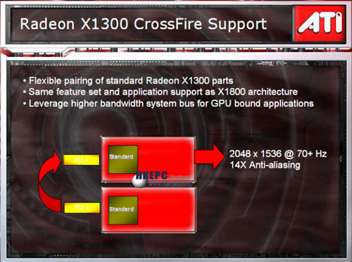 本来说不支援CrossFire的RV515 Radeon X1300,现在又变成支援CrossFire了,不过ATi并没有打算为其推出CrossFire Edition,因为ATi将会开放不用Composition Engine的CrossFire模式给Radeon X1300,两者的资料会则过PCI-E的频宽达成,同样会支援AFR、SuperTiting、Scissor及提高画质的SuperAA Reeading Mode。据编辑部和ATi的电话会议中表示,现时并未知会否开放不用Composition Engine的CrossFire模式给Radeon X1600及Radeon X1800,因为Radeon X1300属于低阶,其速度及解像度将不会被用家开于得太高,因此透过PCI-E频宽成沟通影响不大,但在高阶使用没有Compositing Engine,则会出现大幅的效能差异,据ATi透露大约于高层使用非Compositing Engine,因比使用Compositing Engine下降60%效能。