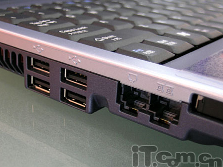 这款Joybook2100E接口主要集中在机身的左侧,产品提供了4个USB 2.0接口、RJ11和RJ45、VGA接口等常用接口和PCMCIA扩展槽等,而作为低端机型,2100E并没有提供IEEE 1394接口和读卡器。而且作为15寸的机型,把大部分扩展接口集中在一边并不是明智的设计,这样会造成很大的不便。