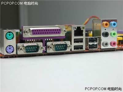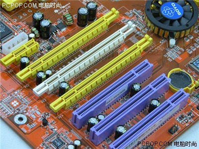 在内存上,板上还提供了高达四条的内存插槽,最高支持4GB的双通道DDR内存,插槽用黄色和紫色来区分,用户只需将内存插入相同颜色的插槽上就可组成双通道,非常方便。