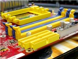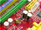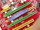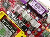 由于具备了“魔力32X”技术,大家可以从图中看到,主板在扩展接口方面与其他主板略有不同??其具备了3个PCI-E x16和1个PCI-E x1插槽。另外,主板还提供了3个PCI及4个DIMM插槽,4个SATA、2个P-ATA及10个USB2.0接口。