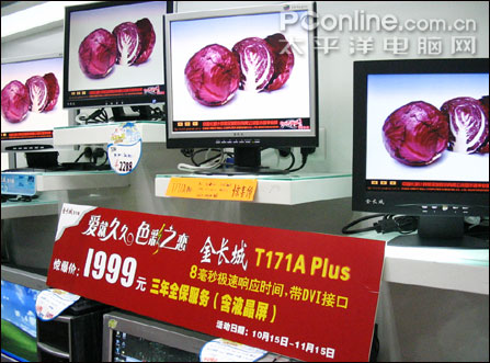 17寸液晶已经进入了白热化竞争阶段,这很大程度上推动了LCD向主流发展:高亮度对比度,8ms极速响应等,金长城一举将这款定位较高档的T171A Plus下调至2000元以下,相当具吸引力,但促销活动只进行一个月时间,心动的用户要把握好机会了。