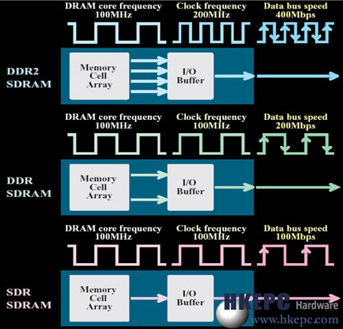 而DDR 2则是承继DDR并作出改良,同样能在每一笔充电放电时都能存取,但DDR 2却改良了I/O Buffer部份,以往记忆体颗粒的时脉相等于I/O Buffer的时脉,但DDR2的I/O Buffer会被提升至却记忆体核心时脉的一倍,而DDR 2记忆体会在每一个Mhz传送4Bit的资料给I/O Buffer,比DDR每笔传送2Bit多一倍,故此在同一记忆体核心时脉下,DDR 2的记忆体会比DDR速度快一倍,这技术称为4Bit Prefetch。DDR 2未来提升速度的空间会比DDR强,因为每提升1 Mhz DRAM的时脉,所得到的效果却是传统SDRAM的四倍。不过我们经常提及DDR 2的时脉是Clock Frequency,而不是DRAM Core Frequency,故此DDR 2 533的时脉还是266Mhz。