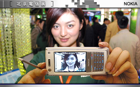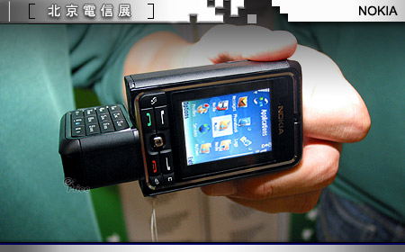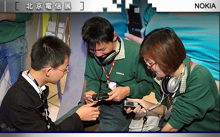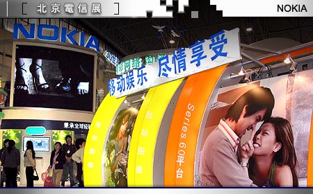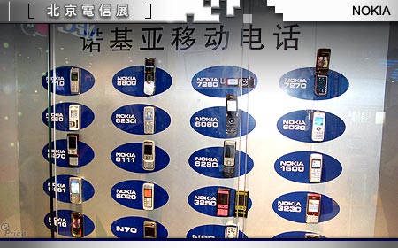在手机市占率大战中,正与 Motorola 争得你死我活的 Nokia,此次电信展主题除了将现有主力机种全挂在墙上展示以外,另外也不忘为其它技术应用如:无线传输、3G 科技等开辟专区,打着「移动娱乐、尽情享受」的大旗,不仅让参观民众看到最新的手机,也实际教导民众如何享用行动科技带来的欢乐。