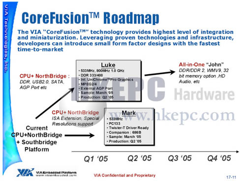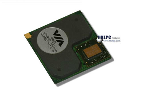 图为首颗CoreFusion处理器代号为"Mark",它早于2003年CeBIT便正式发布,我们可以看到它是把Eden-N处理器和北桥晶片封装在一起,处理器速度为533MHz,并拥有128KB L1及64KB L2 Cache,电压为1.05V并支援SSE及MMX指令集。北桥方面则采用CLE266晶片,最高支援SDR 133MHz及DDR266容量最高为2GB。绘图方面,支援AGP 8X绘图接口并内S3 UniChrome,提供Mpeg 2硬件解码功能,3D能力方面支援DirectX 7,拥有1条Pixel Shader流水线及2个Texture引擎,整颗Mark CoreFusion最高功耗为7W,在当时来说是十分惊人的设计。南桥方面,Mark CoreFusion可配合VT686B、VT8235及VT8237南桥晶片,可惜的是它内建CLE266北桥,只支援266MB/s的V-Link南北桥传输比较落后,不过当它配合VT686B南时就能支援ISA接口,适用于工业用的ISA控制卡,虽然CoreFusion早在2003年CeBi已经t发布,但却要等到2005才由概念产品变成真正的出售的东西。